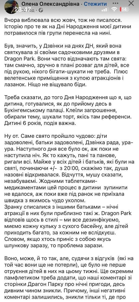 Мати одного з постраждалих, шестирічного хлопчика, Яна Поліванова розповіла, що стан сина різко погіршився наступного дня після святкування дня народження в Dragon Park.