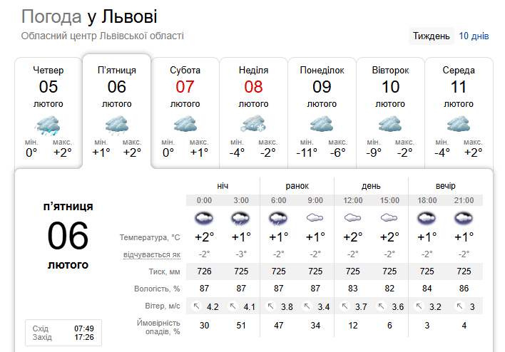 Згідно з даними порталу Sinoptik, найближчі два дні — 6 та 7 лютого — стануть періодом короткочасного потепління, зокрема 6 лютого очікується, що протягом усієї доби буде похмуро.