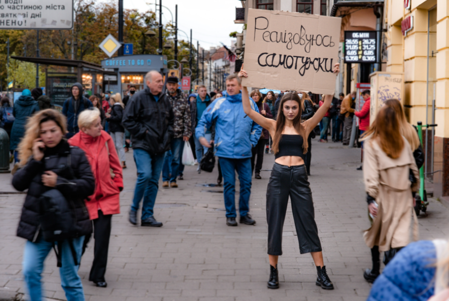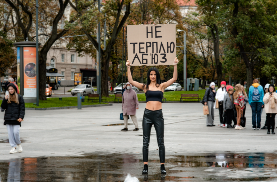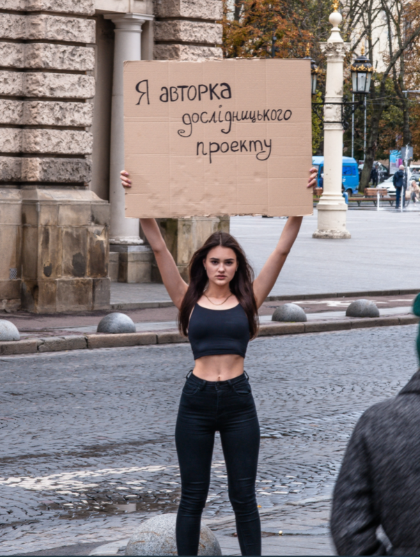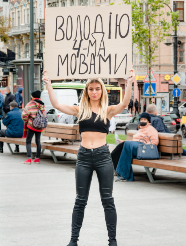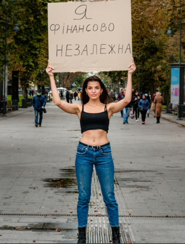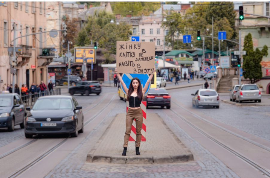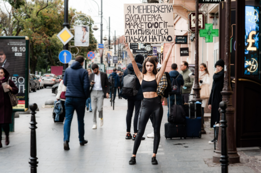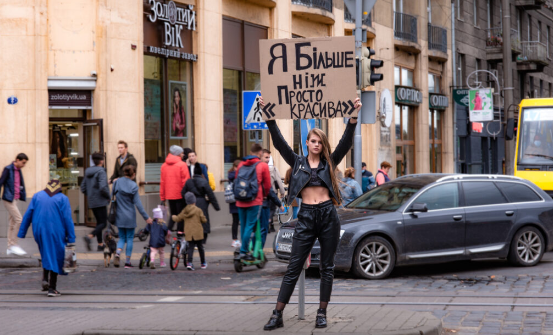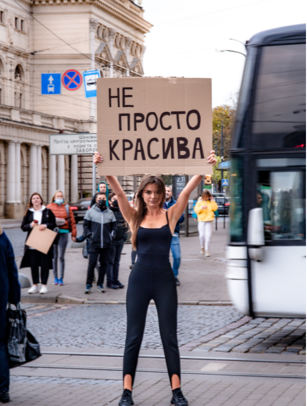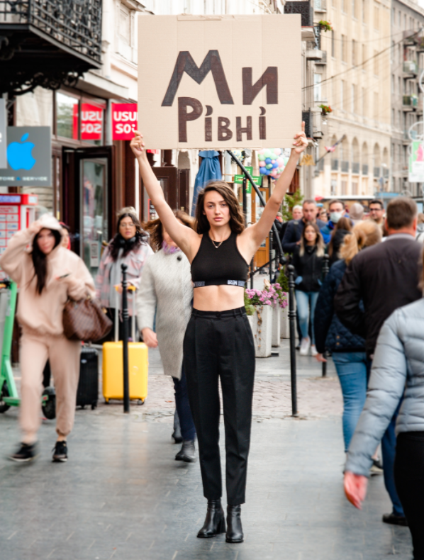 Дівчата вийшли на вулиці міста із плакатами: "Ми рівні","Не просто красива", "Володію чотирма мовами", "Я авторка дослідницького проєкту", "Не терплю аб’юз", "Я фінансово незалежна", "Успішна в бізнесі, а не на кухні", "Реалізовуюсь самотужки", "Я менеджерка, бухгалтерка, маркетолог, а ти дивишся тільки на тіло", "Жінку в клітку не замкнеш, навіть в золоту", "Я більше, ніж просто красива".